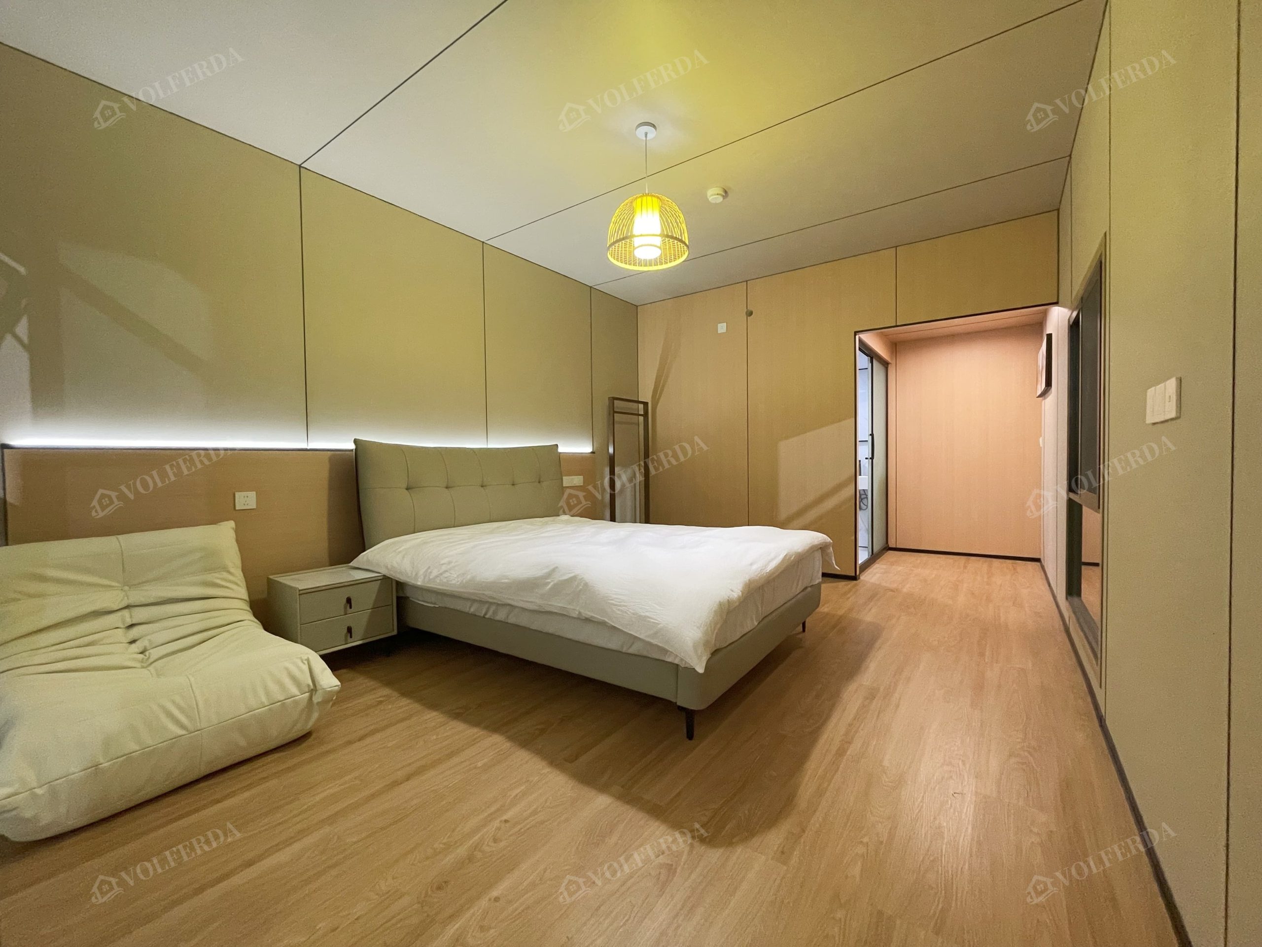 - kitchen (induction cooker,lower and upper cabinets, sink, artificial stone countertop), bathroom (toilet, sink, smart mirror, sink cabinet, sofa, coffee table, TV cabinet, double bed, bedside table, refrigerator, TV.