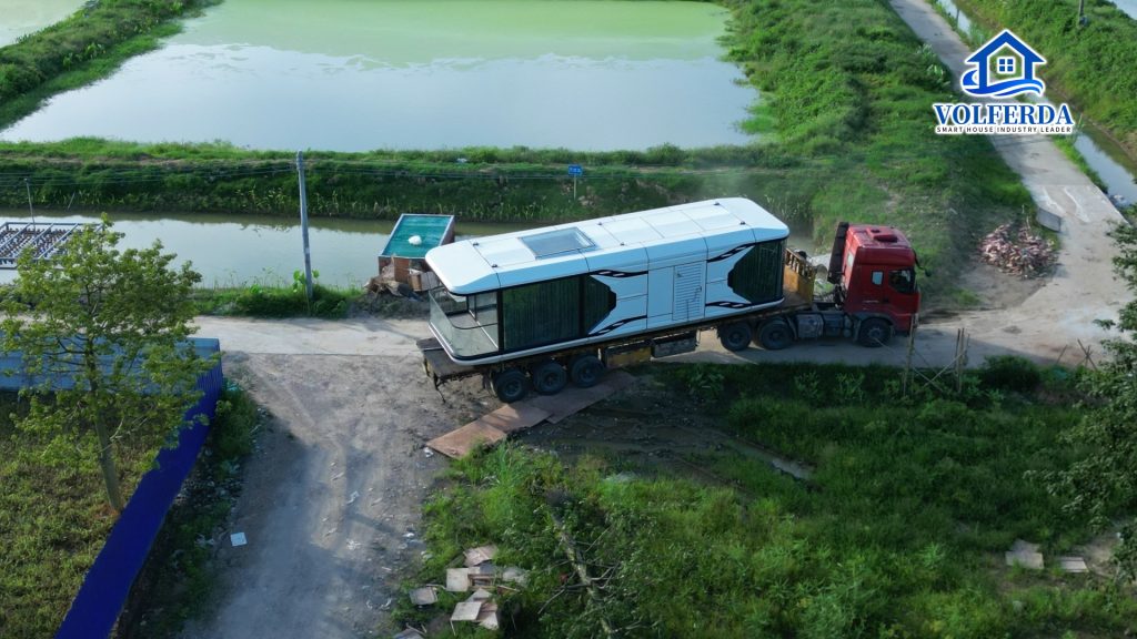 The house is fully completed at the factory before being shipped. This is usually done using 40-foot high cube containers (40HQ) or flat rack containers.